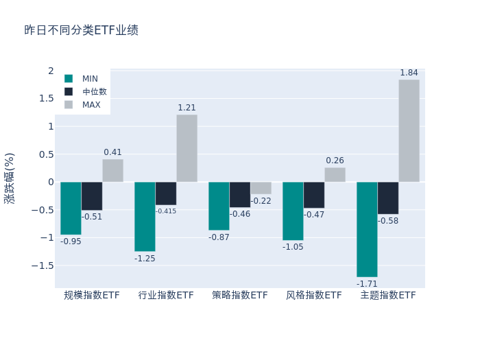 昨日股票型ETF收益率中位数为-0.51%。其中按照不同分类,规模指数中鹏华上证科创板50成份增强策略ETF收益率最高,为0.41%;行业指数中国泰中证全指软件ETF收益率最高,为1.21%;策略指数中红利LV收益率最高,为-0.22%;风格指数中嘉实新兴科技100ETF收益率最高,为0.26%;主题指数中华夏中证动漫游戏ETF收益率最高,为1.84%。