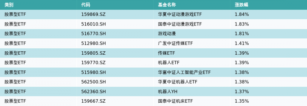 昨日股票型ETF涨幅最高的3支ETF及其收益率分别为:华夏中证动漫游戏ETF(1.84%)、国泰中证动漫游戏ETF(1.83%)、游戏动漫(1.81%)。涨幅前10详情见下表: