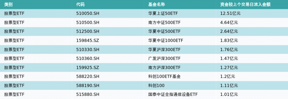 昨日股票型ETF资金流入最多的3支ETF及其流入金额分别为:华夏上证50ETF(流入12.51亿元)、南方中证500ETF(流入4.64亿元)、华夏中证500ETF(流入2.64亿元)。资金流入前10详情见下表:
