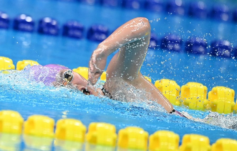 9月24日,中国队选手李冰洁以15分51秒18破赛会纪录的成绩摘得女子1500米自由泳金牌。