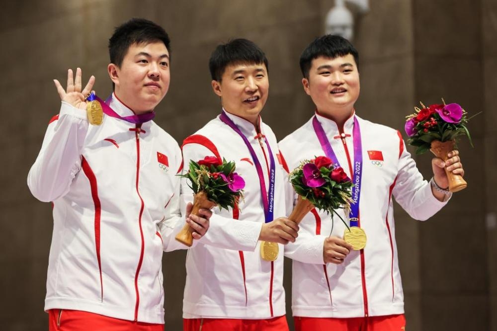 9月25日,男子25米手枪速射争夺中,王鑫杰、刘杨攀、李越宏组成的中国队以1765环的破世界纪录成绩夺得团体冠军。