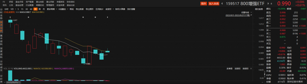 与中证800指数相关的增强ETF——800增强ETF(159517)早盘高开后维持在昨日收盘价上方震荡,盘中现溢价交易。截至发稿,该ETF上涨0.61%,溢折率达0.07%。