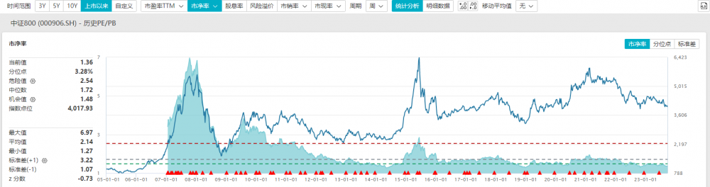 从估值来看,中证800指数当前市净率处于历史低位区间。Wind数据显示,截至9月26日收盘,中证800指数市净率为1.36倍,位于上市以来3.28%分位点。
