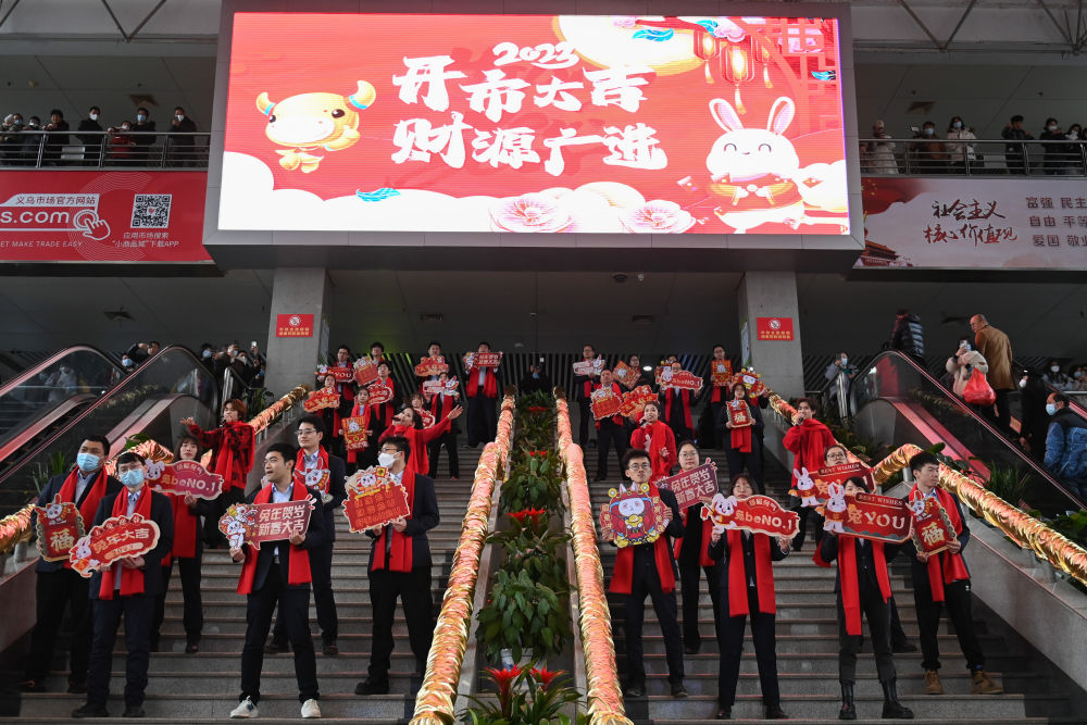 商户代表在义乌国际商贸城的大厅进行文艺表演(2023年2月2日摄)。新华社记者 黄宗治 摄