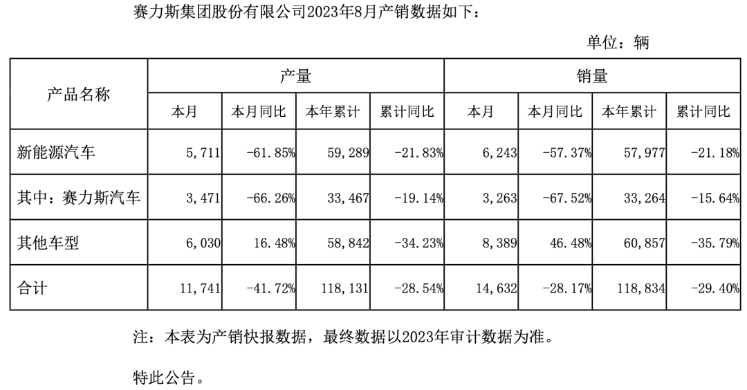 根据赛力斯发布的8月产销快报显示,当期包括AITO问界在内的新能源汽车销量为6243辆,同比下滑57.37%;
