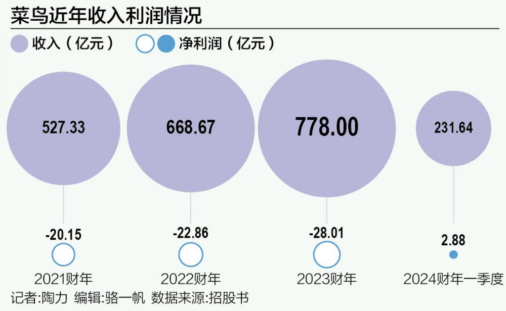 招股书显示,2021财年至2023财年(截至3月31日止年度),菜鸟的总收入分别为527.33亿元、668.67亿元、778亿元。截至今年6月30日的2024财年一季度,菜鸟实现总收入231.64亿元,同比增长33.62%。