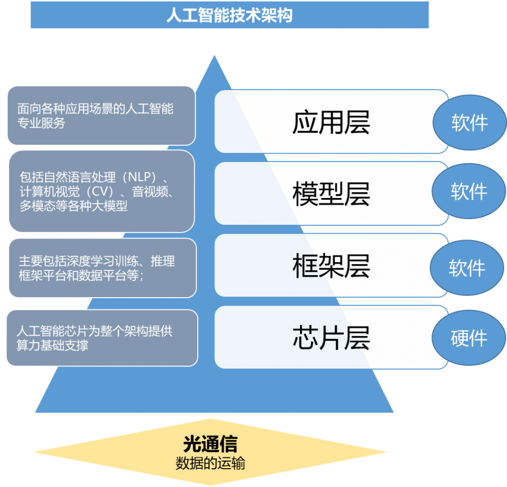 客观来说,AI(人工智能)架构分为芯片层、框架层、模型层、应用层,芯片层属于硬件,而框架层、模型层、应用层则均属于软件。海量数据的运输有赖于光通信,因此光通信被称为数据的高速公路,在人工智能架构中承担了基础设施的功能。