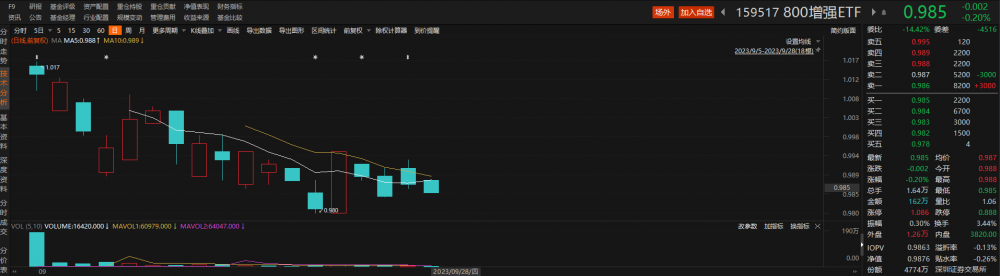 与中证800指数相关的增强ETF——800增强ETF(159517)盘中小幅调整。截至发稿,该ETF下跌0.20%,换手率达3.44%。
