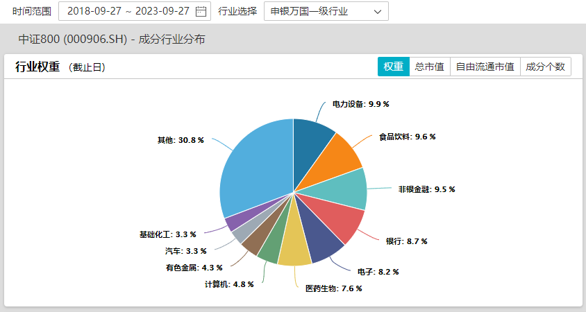 据Wind数据,从成分股所属申万一级行业分布来看,截至9月27日,中证800指数(000906)成分股所属行业权重均未超过10%,其中电力设备(9.9%)、食品饮料(9.6%)、非银金融(9.5%)、银行(8.7%)、电子(8.2%)位列前5。