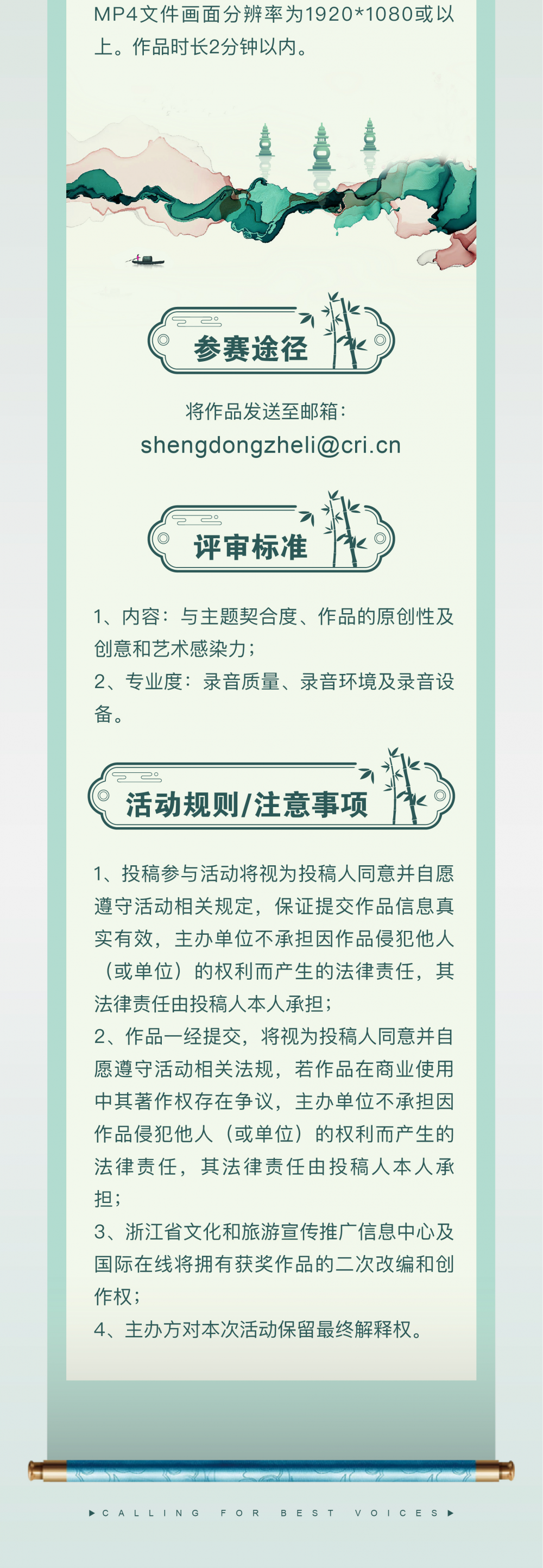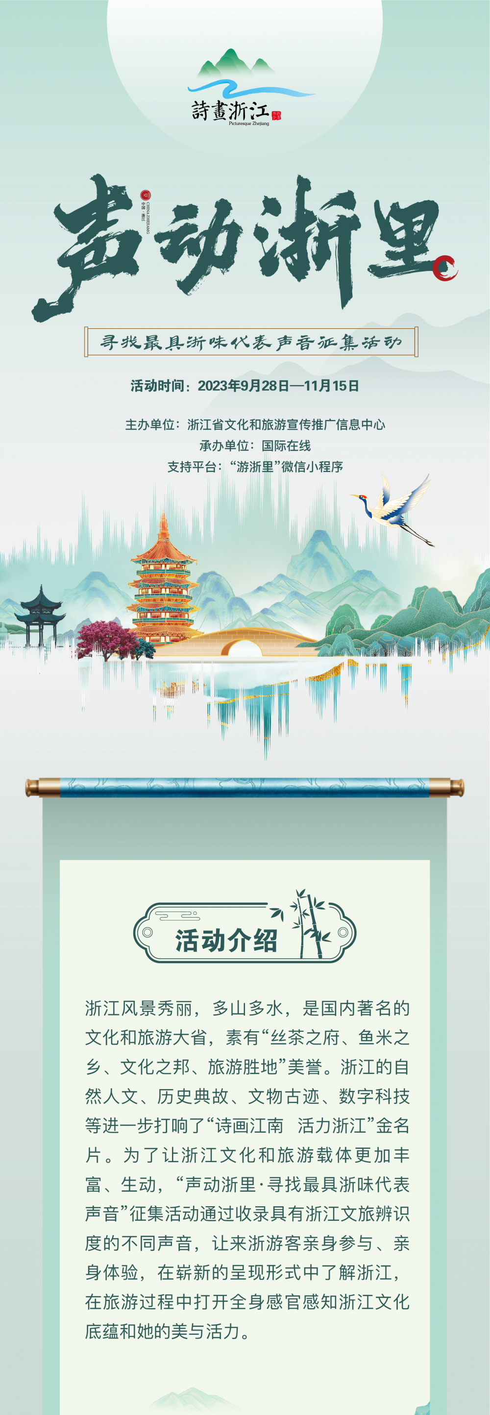 相知无远近,万里尚为邻。乘着杭州亚运会的东风,由浙江省文化和旅游宣传推广信息中心主办、国际在线承办、“游浙里”微信小程序支持的“声动浙里·寻找最具浙味代表声音”征集活动于2023年9月28日启动。
