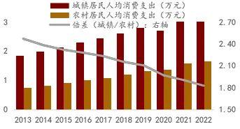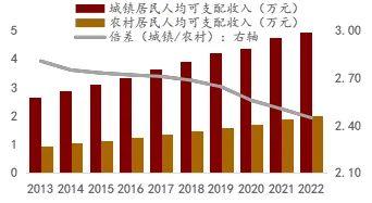 农村人均收入与消费支出不断增长,且与城市的差距不断缩小。由于一二线城市高消费水平与高房贷压力,农村居民人均消费支出与可支配收入实际同比增速持续高于城镇居民,农村与城镇之间的倍差逐年降低,人均消费支出倍差由2013年的2.47降到2022年的1.83。