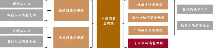 当前中国下沉市场消费规模约为20.74万亿元,在全国占比超半数。根据图中的测算方式,中国消费总规模 = 城镇消费总规模 + 农村消费总规模 = 一线城市消费规模 + 新一线城市消费规模 + 二线城市消费规模 + 下沉市场消费规模。