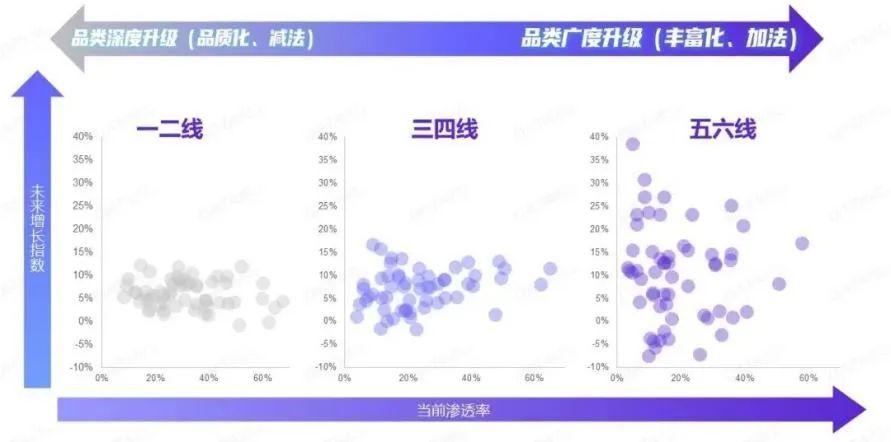 数字100研究的11个食品饮料大类和57个子类行业的渗透率和未来增速图中显示,下沉市场在产品丰富性方面相对匮乏,当务之急是拓展供给的广度,而高线城市消费品的发展方向则是消费的深度升级、品质化发展。