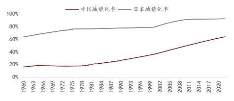 城镇化率上,我国目前相当于日本1970年的水平。2000年起城镇化率进入较高速增长的阶段,2022年城镇化率达到65.4%,从趋势来看快速成长期到了瓶颈期,跟日本1970年左右的情况较为相似。