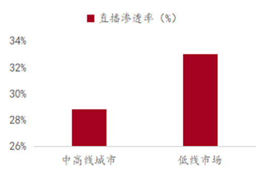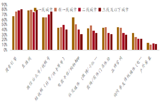 线上渠道依赖性强,直播渗透优势明显。“有闲经济”背景下,下沉市场消费者闲暇时间较多,能够在线上渠道进行更精细的信息整合,信息获取也更加依赖线上渠道。