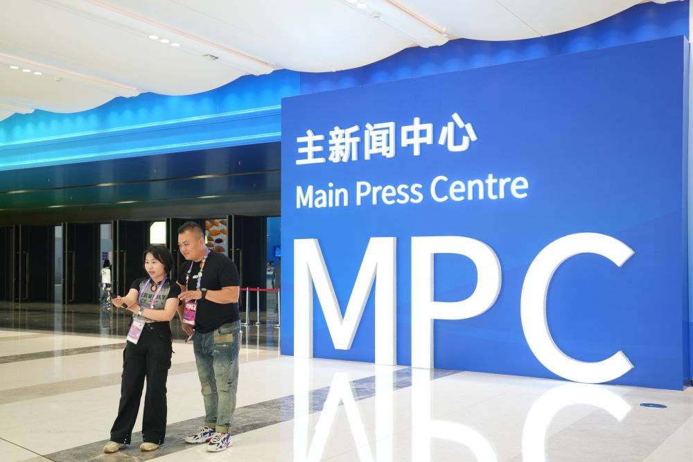 9月18日,媒体工作人员在杭州亚运会主媒体中心内的主新闻中心前工作。新华社记者 薛宇舸 摄