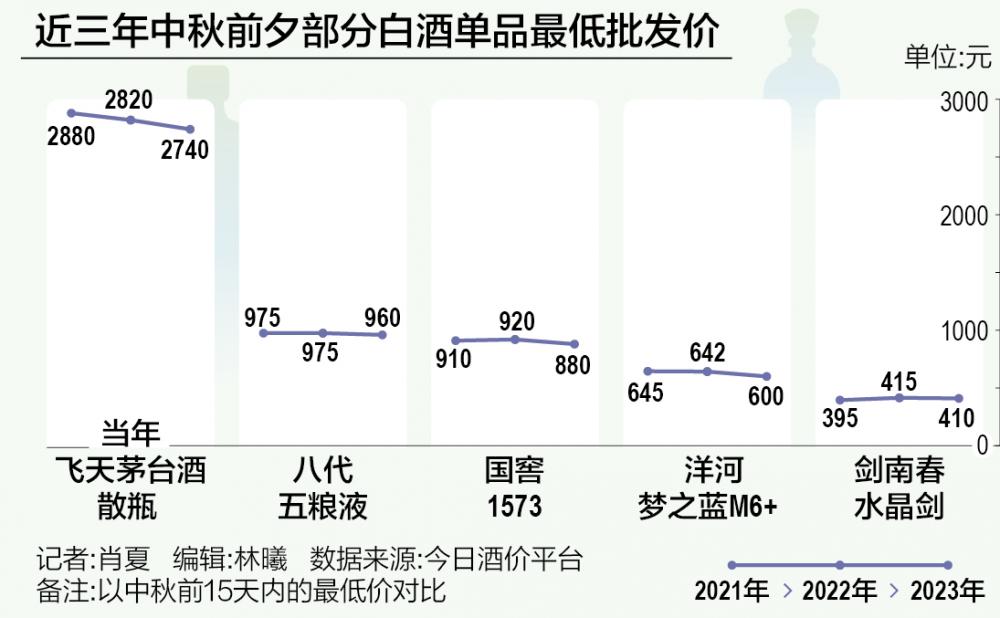 今日酒价的数据显示,今年双节前夕散瓶53度飞天茅台酒批发价连续多日不到2800元,比两年前同期3000元+的价格有显著下滑,也稍低于去年中秋前夕。有做白酒回收的重庆酒商对21世纪经济报道记者说,茅台价格相对稳定,但今年的出货不如前两年那么快。