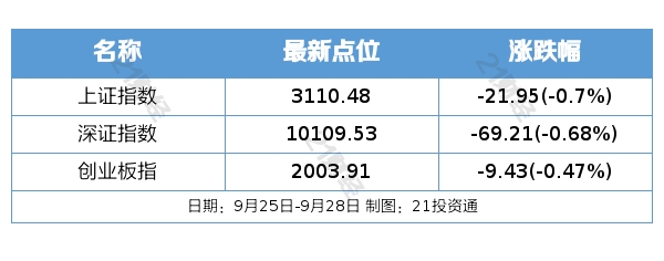 中秋、国庆假期前的四个交易日(9月25日-9月28日),A股三大指数震荡走低。截至最新(9月28日)收盘,沪指报3110.48点,周跌0.7%;深成指报10109.53点,周跌0.68%;创业板指报2003.91点,周跌0.47%。