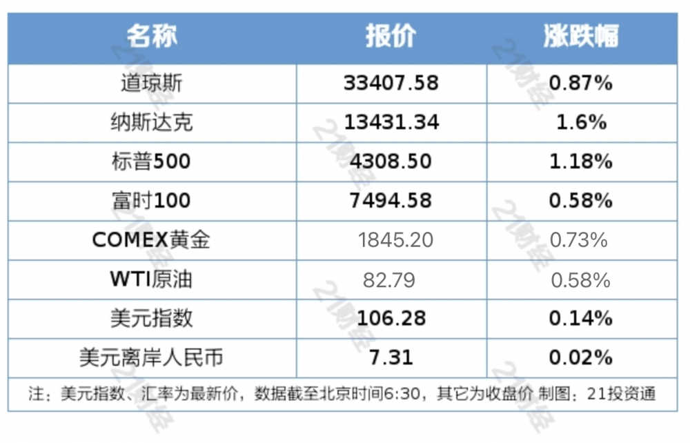 纽约股市三大股指10月6日上涨。截至当天收盘,道琼斯工业平均指数比前一交易日上涨288.01点,收于33407.58点,涨幅为0.87%;标准普尔500种股票指数上涨50.31点,收于4308.50点,涨幅为1.18%;纳斯达克综合指数上涨211.51点,收于13431.34点,涨幅为1.60%。