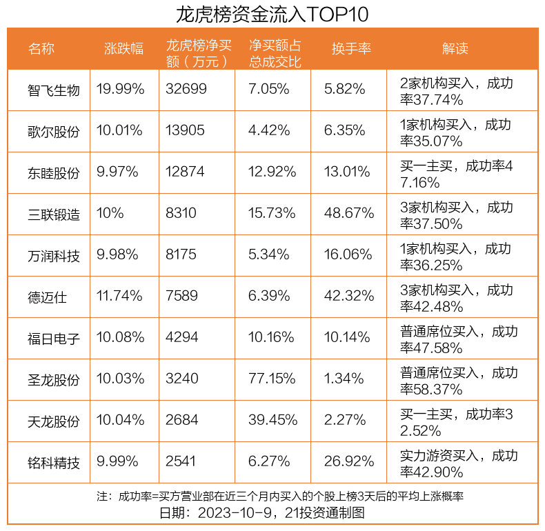 10月9日,上证指数下跌0.44%,深证成指下跌0.03%,创业板指下跌0.26%。盘后龙虎榜数据显示,共有43只个股因当日异动登上龙虎榜,资金净流入最多的是智飞生物(300122.SZ),达3.27亿元。