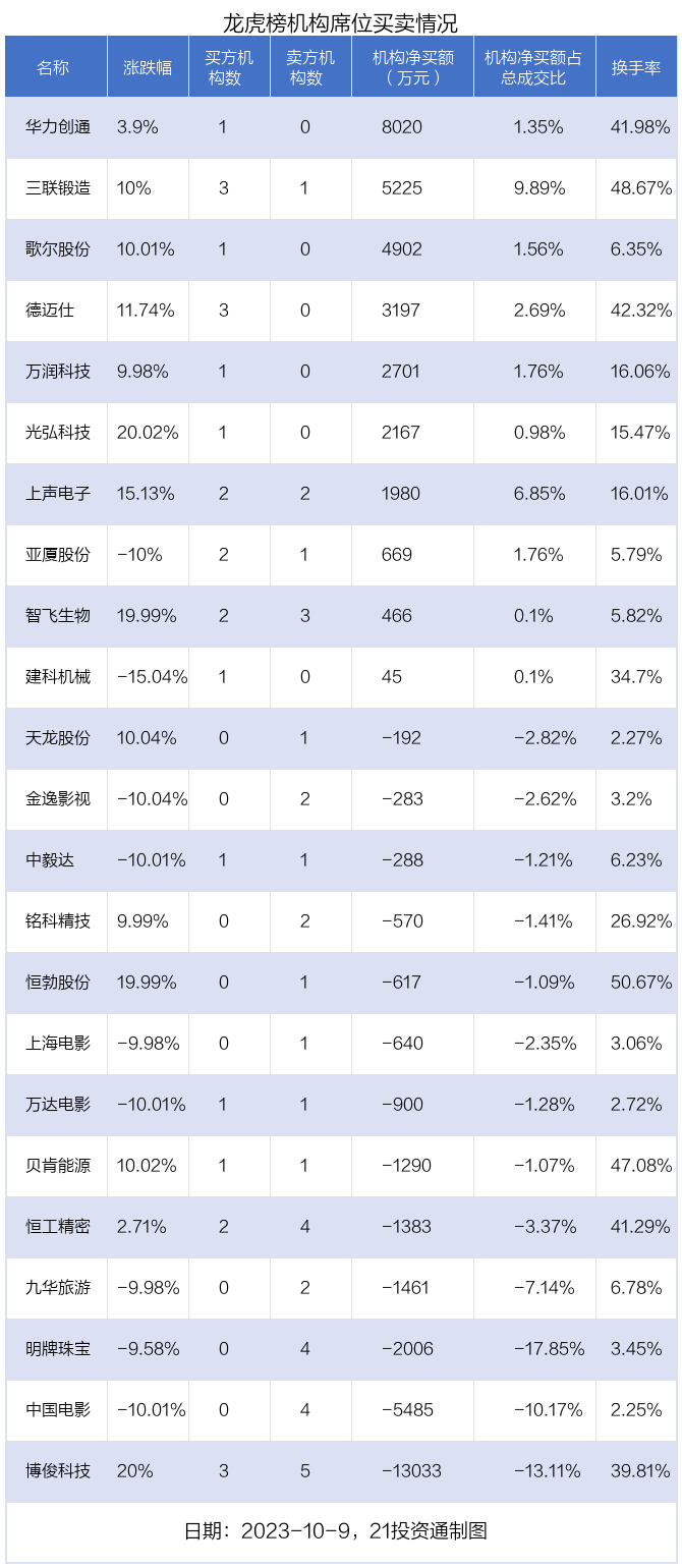 10月9日,23只个股龙虎榜出现了机构的身影,机构合计净买入1224.09万元。具体来看,机构净买入10股,净卖出13股。