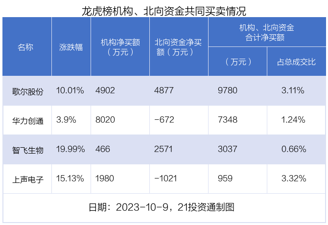 值得注意的是,机构和北向资金共同净买入了歌尔股份、智飞生物等2股;在华力创通、上声电子上出现分歧,机构净买入华力创通8020.47万元,北向资金净卖出672.24万元;机构净买入上声电子1980.06万元,北向资金净卖出1021.12万元。