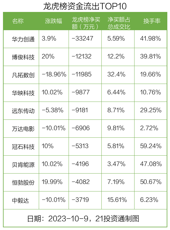 而龙虎榜中资金净流出最多的是华力创通(300045.SZ),被净卖出为3.32亿元,占总成交金额的5.59%。华力创通收盘上涨3.9%,换手率为41.98%。