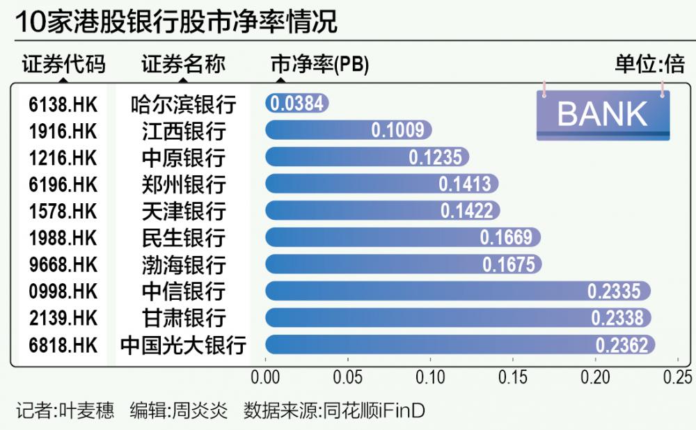 除了哈尔滨银行之外,港股市场上,低于0.2倍市盈率的上市银行还有江西银行、中原银行、郑州银行、天津银行、民生银行、渤海银行等,这显示在一定程度上,资金对于H股银行板块处于“冷眼旁观”的状态。