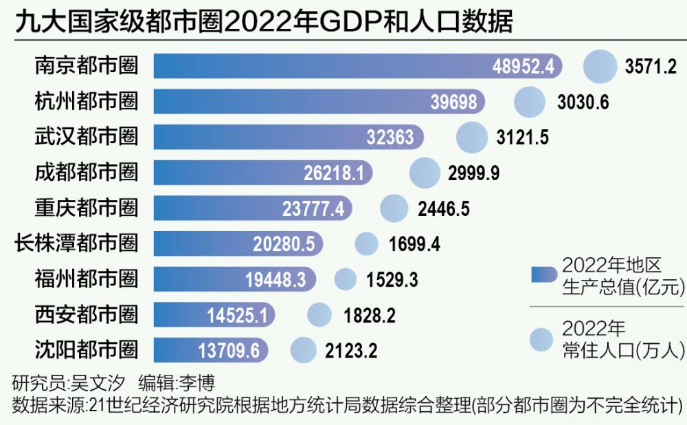 从人口规模来看,南京、武汉、杭州3个都市圈2022年常住人口已经达到3000万以上,成都、重庆、沈阳都市圈人口规模也在2000万以上,西安、长株潭、福州都市圈在千万以上。