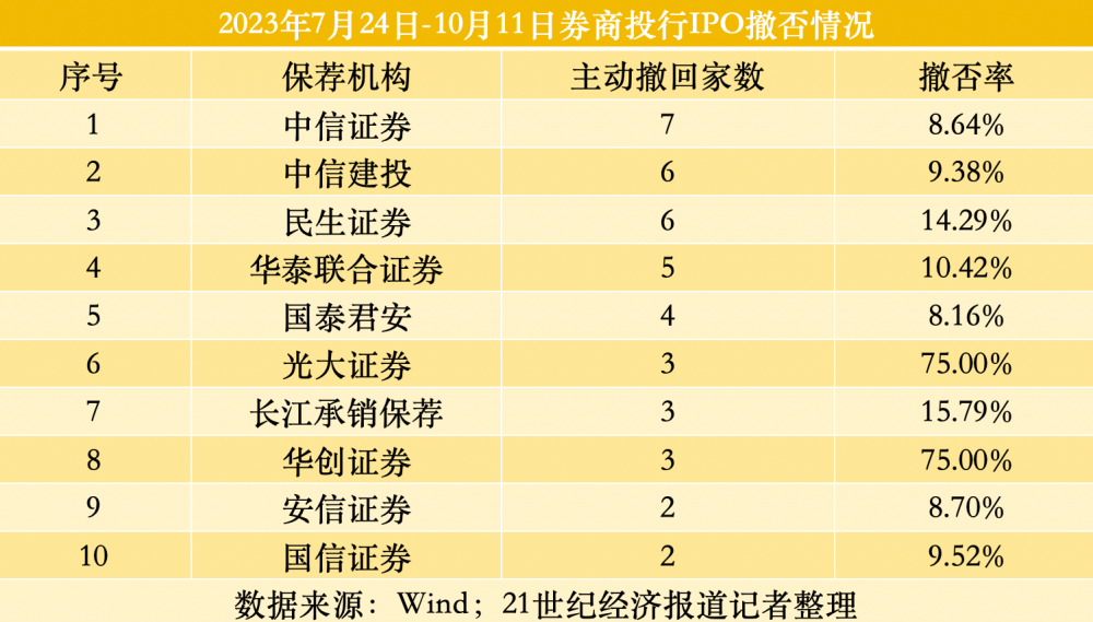 而从投行撤否情况来看,7月24日-10月11日,撤否项目家数与保荐家数基本成正比。撤否家数在4家及以上的券商共5家,其保荐企业家数均位列行业前七。