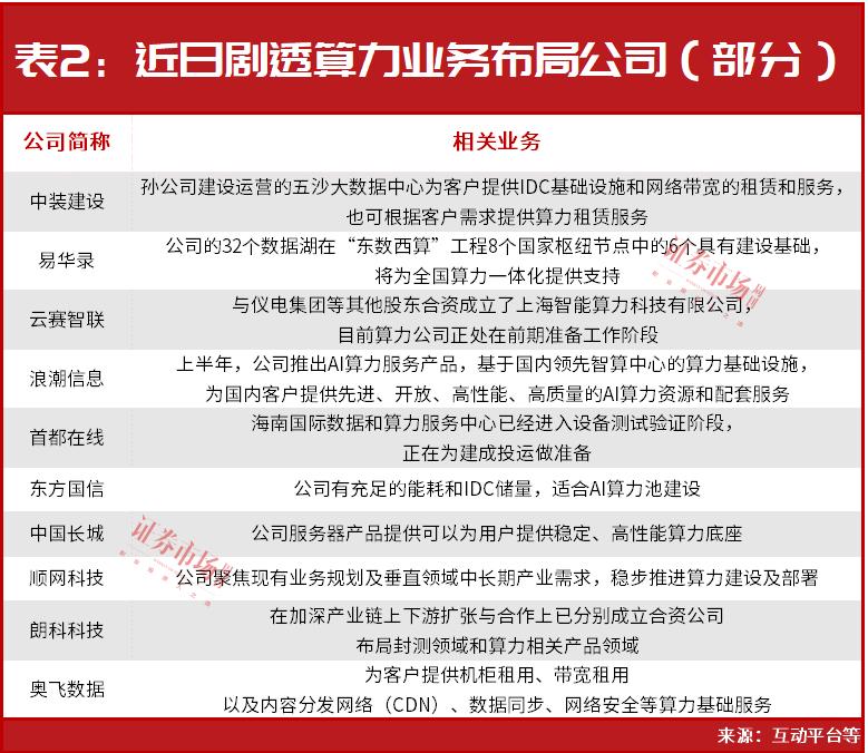 此外,中装建设、易华录、云赛智联、浪潮信息、首都在线、东方国信、中国长城等多家公司也在近期剧透在算力方面的相关布局(见表2)。