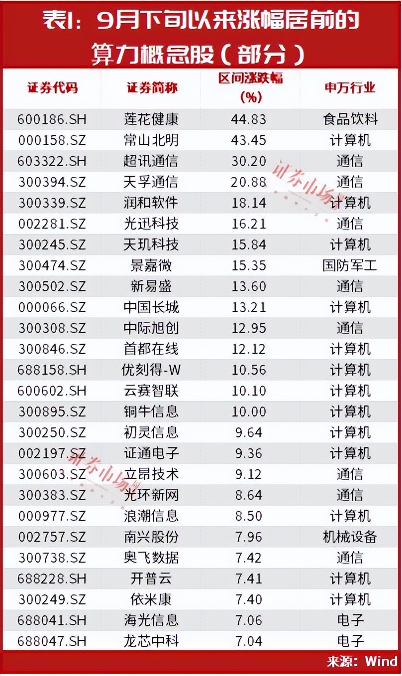 莲花健康股价被热炒背后,市场对于算力板块的整体关注度也在升温。 自9月下旬以来(截至10月11日,下同),算力板块即开启了持续反弹模式,截至目前,已累计上涨超6%。 部分个股更是迎来强势上涨,如莲花健康、常山北明、超讯通信、天孚通信等期间涨幅均超过20%,润和软件、光迅科技、天玑科技、景嘉微、新易盛、中国长城、中际旭创等多只个股涨幅均超过10%(见表1)。