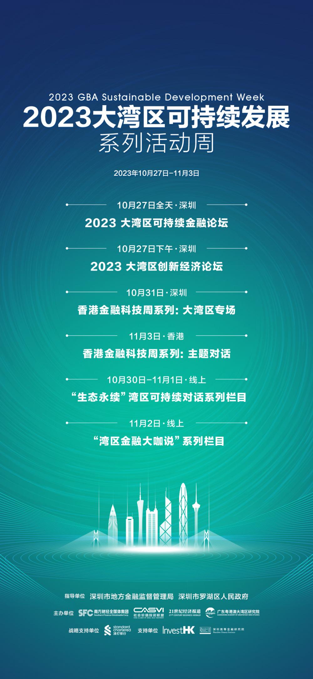 探路粤港澳大湾区可持续金融与创新经济发展,2023年10月27日至11月3日,由深圳市地方金融监督管理局、罗湖区人民政府指导,南方财经全媒体集团、社会价值投资联盟(深圳)、21世纪经济报道、广东粤港澳大湾区研究院联合主办的“2023粤港澳大湾区可持续发展系列活动周”(下称“活动周”)将在深圳、香港两地举行。