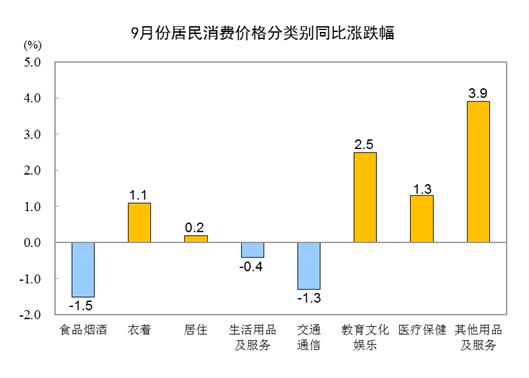 国家统计局:9月CPI同比持平 环比上涨0.2%
