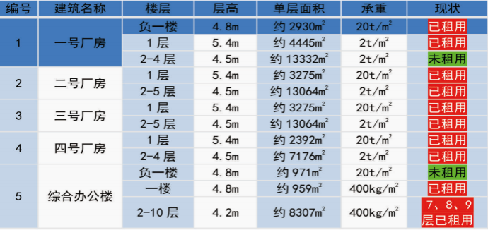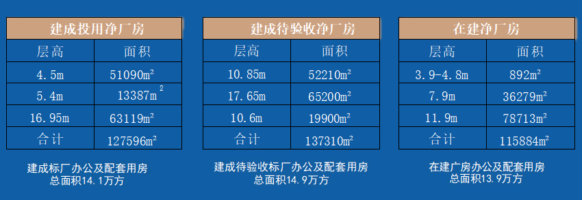 占地面积:总用地面积41808.12m²,建筑面积74137.14m²,计容面积70235.46m²,不计容面积3901.68m²,四栋厂房总面积60992.6m²,1栋办公楼9214.48m²,2个门卫室28.38m²。