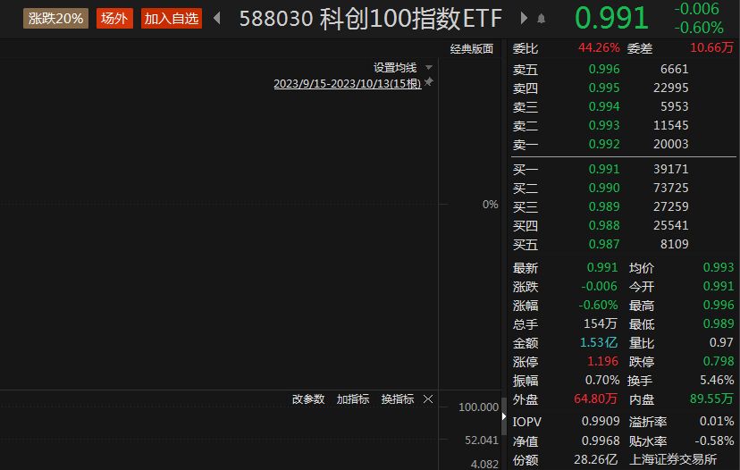 科创100指数ETF(588030)早盘收跌0.6%,溢折率0.01%,成交额1.53亿元,换手率5.46%,交投活跃,近5日资金持续净流入超4.3亿元。