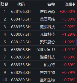A股市场早盘走低,受此影响,科创板个股多数下跌。相关指数中,科创100指数 (000698)走低,成分股跌多涨少。上涨成分股中,博瑞医药20cm涨停,萤石网络涨5%,键凯科技、光峰科技、聚辰股份、百利天恒-U、道通科技、铂力特、东方生物、圣湘生物等跟涨。