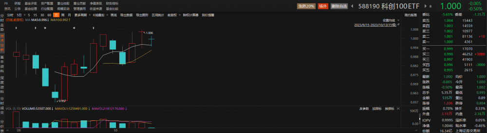 跟踪科创100指数的科创100ETF(588190)早盘跟随指数出现调整,但盘中现溢价交易。截至发稿,该ETF下跌0.50%,溢折率为0.05%。