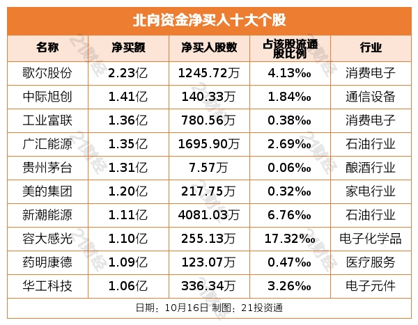 个股方面,北向资金净买入歌尔股份(002241.SZ)、中际旭创(300308.SZ)、工业富联(601138.SH)、广汇能源(600256.SH)、贵州茅台(600519.SH)居前,其中,歌尔股份被净买入2.23亿元,中际旭创被净买入1.41亿元,工业富联被净买入1.36亿元,广汇能源被净买入1.35亿元,贵州茅台被净买入1.31亿元。