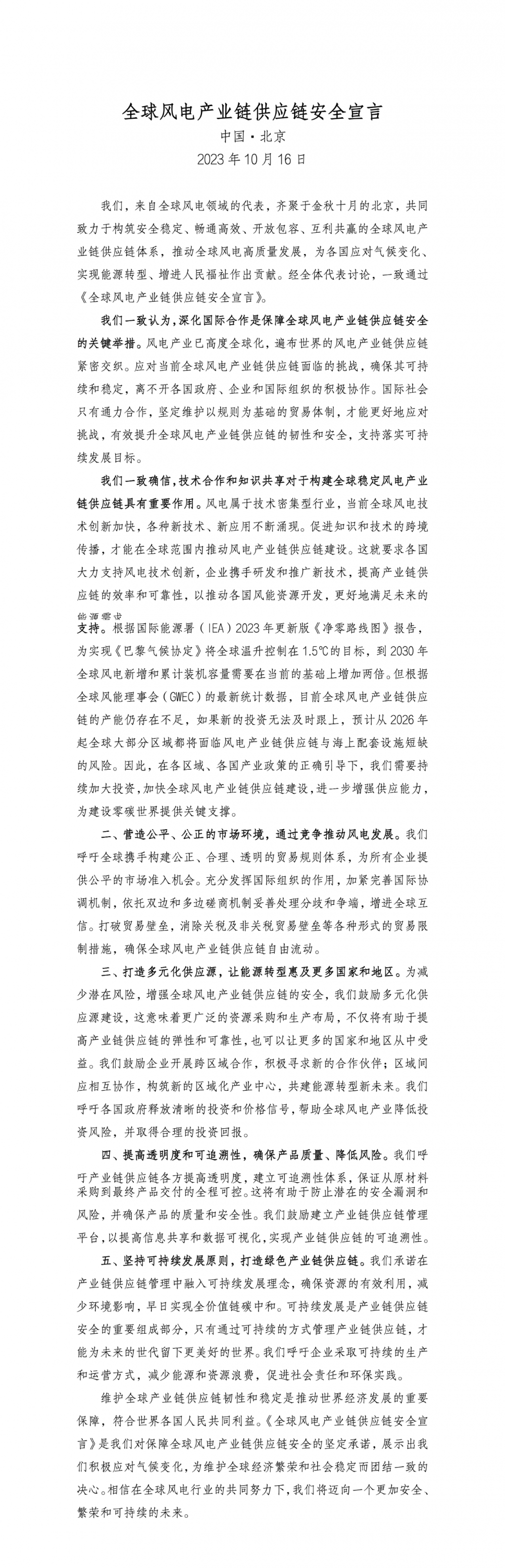 《全球风电产业链供应链安全宣言》,致力于构筑安全稳定、畅通高效、开放包容、互利共赢的全球风电产业链供应链体系,推动全球风电高质量发展,为各国应对气候变化、实现能源转型、增进人民福祉作出贡献