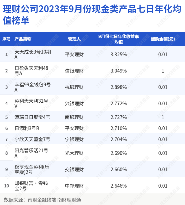 从单品收益角度看,平安理财“天天成长3号10期A”以3.325%的七日年化收益率均值摘得9月现金榜榜首,信银理财“日盈象天天利48号A”以3.049%的七日年化收益率均值位列榜单第二名,这也是本期榜单唯二两只9月七日年化收益率均值超3%的产品。杭银理财“幸福99金钱包9号A款”为榜单第三名,七日年化收益率均值为2.898%。