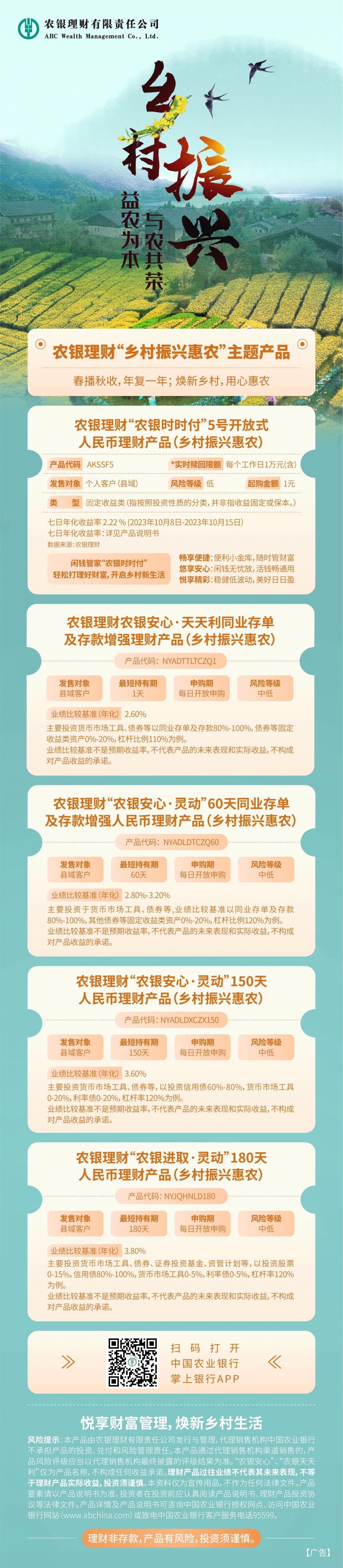 目前农银理财“乡村振兴惠农”系列产品正在持续热销中,欢迎登录中国农业银行掌上银行APP“理财”专区购买。