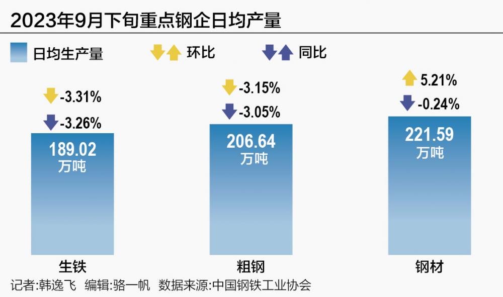 根据中国钢铁工业协会最新统计数据,2023年9月下旬重点钢企生铁日均产量189.02万吨,旬环比下降3.31%,同比下降3.26%;9月下旬重点钢企粗钢日均产量206.64万吨,旬环比下降3.15%,同比下降3.05%;9月下旬重点钢企钢材日均产量221.59万吨,旬环比上升5.21%,同比下降0.24%。从重点大中型钢铁企业日均产量来看,大中型钢铁生产企业的产能释放连续3个月放缓。