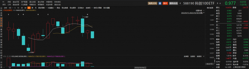 跟踪科创100指数的科创100ETF(588190)早盘走低,但盘中现溢价交易。截至发稿,该ETF下跌1.01%,溢折率为0.02%。