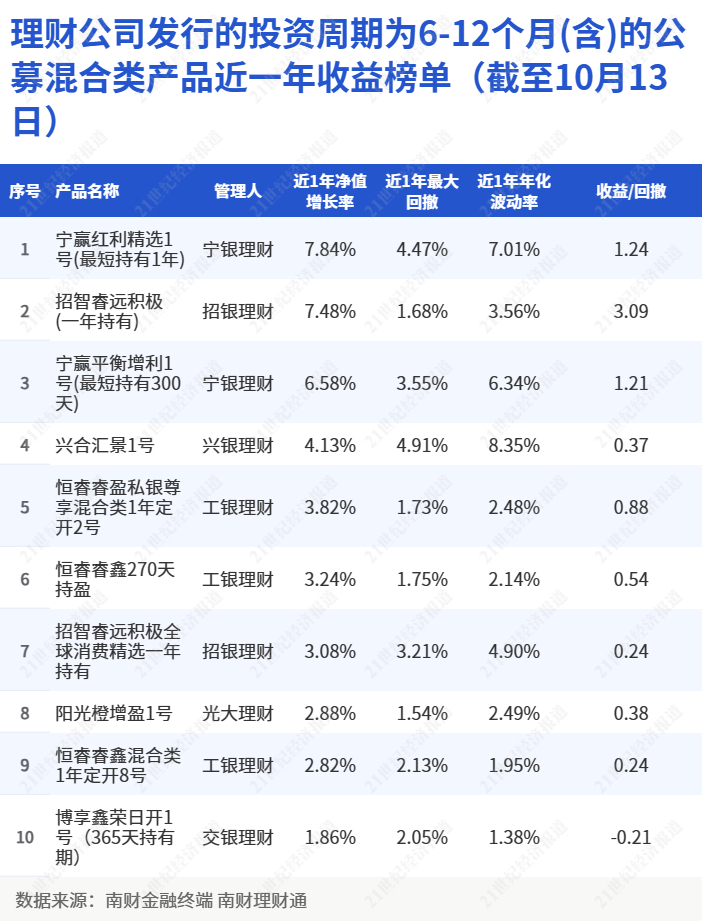 南财理财通数据显示,截至10月13日,在理财公司投资周期为6-12月(含)的公募混合类产品近一年收益排行榜中,6家理财公司产品上榜。工银理财上榜产品数量最多,有3只产品上榜,宁银理财和招银理财各有2只产品上榜,兴银理财、光大理财和交银理财各有1只产品上榜。