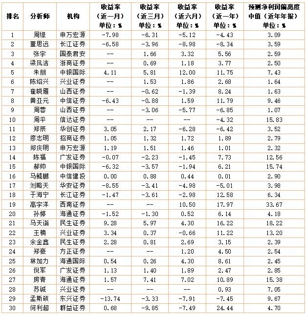此外,前三季度分析师研究实力榜前10名包括浙商证券梁凤洁、中银国际朱朋、兴业证券陈绍兴、山西证券崔晓雁、中信证券黄亚元、山西证券周蓉、信达证券周平。记者留意到,中银国际朱朋、信达证券周平曾在今年的分析师研究实力榜月度榜单中拿到过冠军,其中中银国际朱朋在8、9月连续二度夺冠。