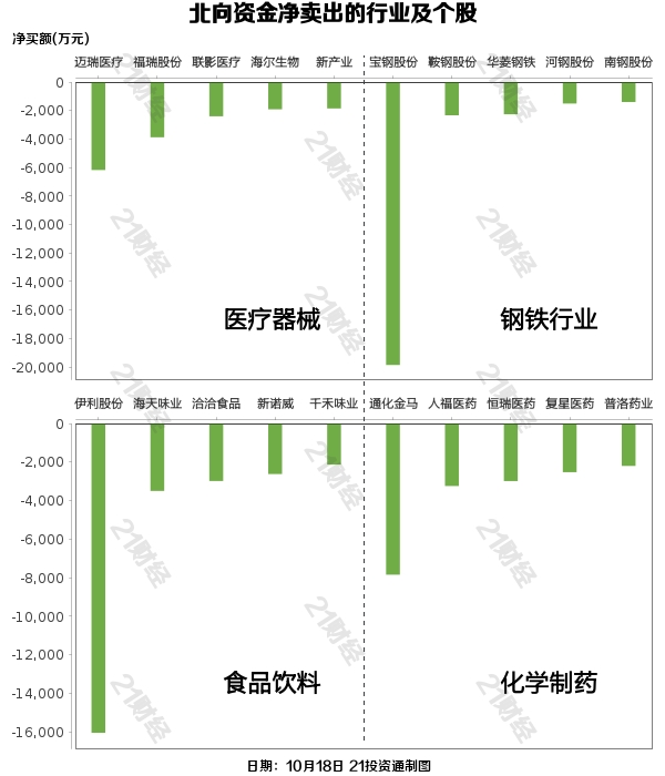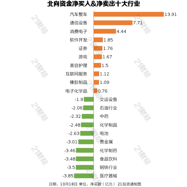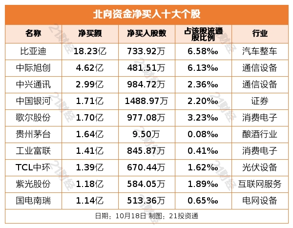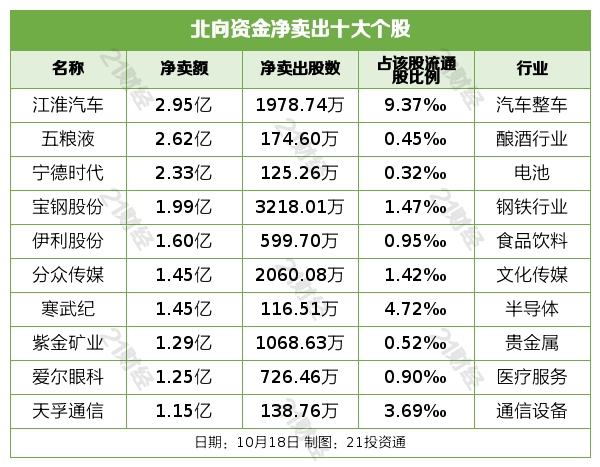 据21投资通智能监测,10月18日,北向资金净卖出11.61亿元,其中沪股通净卖出23.57亿元,深股通净买入11.97亿元。