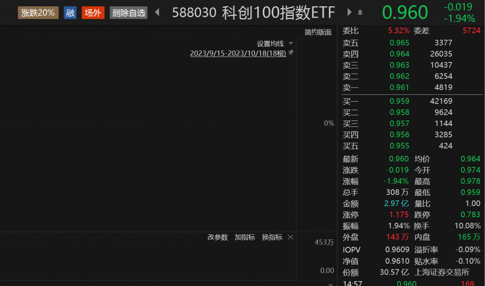 10月18日,大盘全天震荡调整,深成指、创业板指均再创年内新低。科创100指数收跌1.9%,规模最大的跟踪科创100的ETF——科创100指数ETF(588030)收跌1.94%,日成交额2.97亿元,换手率10.08%,盘中交投活跃。