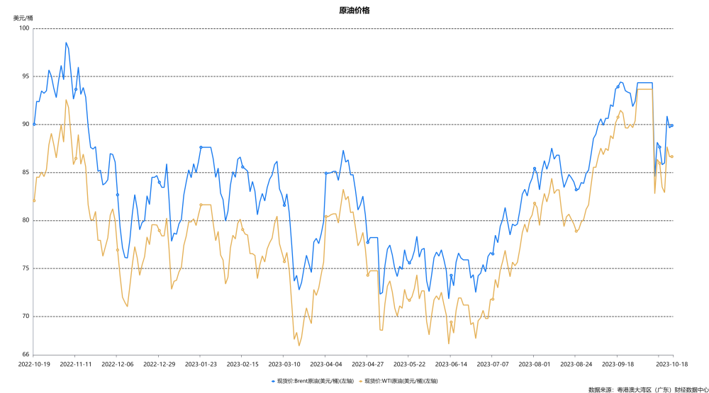 原油价格止跌。10月15日当周,CRB现货综合指数、南华期货工业品指数、大宗商品价格总指数分别较9月末下降0.9%、3.2%和2.8%,除矿产类大宗商品价格指数微涨,钢铁类、能源类及有色金属类大宗商品价格指数均有不同程度的回落,其中能源类降幅相对明显;原油价格止跌,10月18日,Brent和WTI原油现货价分别较10月11日上升2.6%和0.8%至89.9美元/桶、86.7美元/桶,低于上月末水平;铜铝价格继续回落,10月17日,LME铜和铝现货结算价分别较10月10日下降0.8%和2.3%至7846.5美元/吨、2148.5美元/吨。
