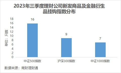 从挂钩指数来看,中证500指数为三季度理财公司商品及金融衍生品第一大挂钩股指。挂钩中证500指数、沪深300指数和中证1000指数的产品数量依次为16只、9只和7只。